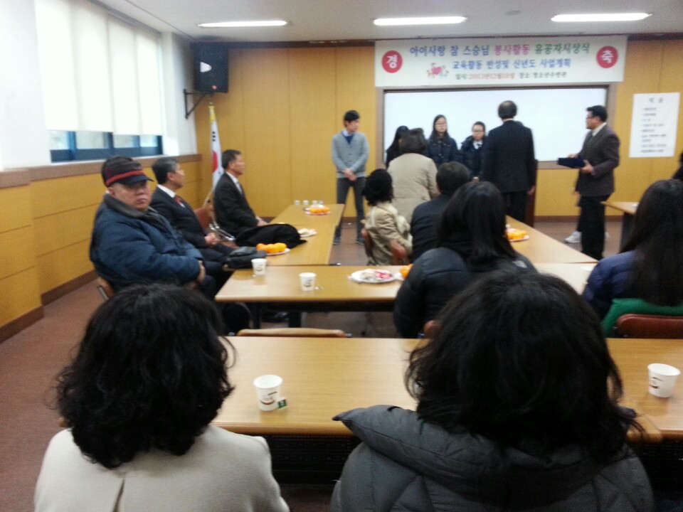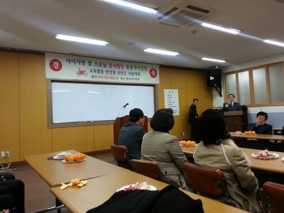 Áö³ 12¿ù 19Àϳ¯ û¼Ò³â¼ö·Ã°ü¿¡ ¿¸° ¾ÆÀÌ»ç¶û Âü ½º½Â´Ô ºÀ»çȰµ¿ À¯°øÀÚ ½Ã»ó½Ä¿¡ Á¾Á¤Å«½º´Ô°ú ÀÓ¿øºÐµé²²¼ Âü¼®Çϼ̽À´Ï´Ù.